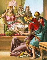 After three days of fasting Esther puts on her royal robes and presents herself to the King. She appears in the hallway within direct view of the king. She anxiously awaits his invitation. Xerxes scepter is offered to her. Esther touches the tip of scepter showing respect and submission to his authority.