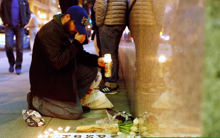 A man gestures as he places a candle at a makeshift memorial outside the Consulate General of France to pay tribute to the victims of the terror attack in Paris, in San Francisco, California November 13, 2015. REUTERS/Stephen Lam – RTS6XJZ