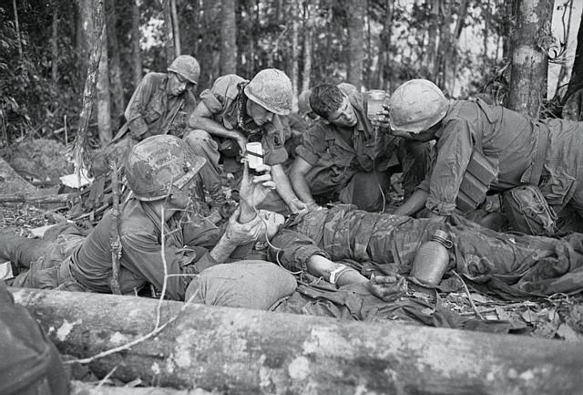Original Caption: Emergency Transfusion. Dak To, South Vietnam: During a bloody battle, when a soldier is wounded and needs a transfusion, it takes place there on the spot, in the battle zone. Here, a G.I. gets a transfusion near infamous Hill 875, captured by American forces after some of the most violent fighting of the war in Vietnam. North Vietnamese troops poured heavy mortar fire on an artillery base near Dak To and the Special Forces camp in Kontum, 40 miles to the South.