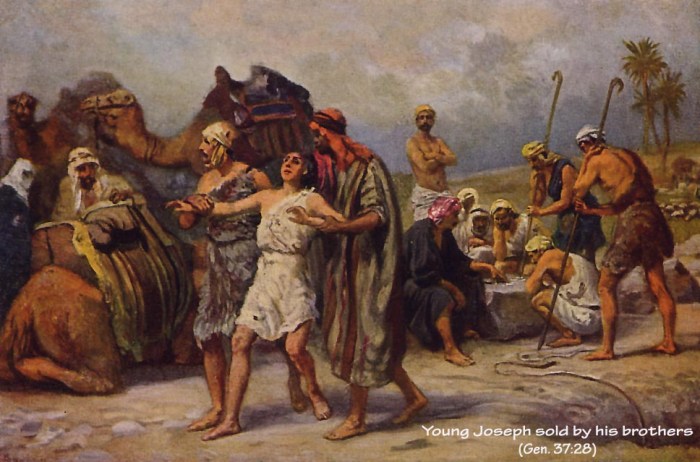 The dream and the ornate garment where not prompted by Joseph. The God of Jacob gave Joseph the dream. Jacob, Joseph’s father, out of love for the son of his old age, gave Joseph an ornate garment. As father he had the prerogative to give whatever he wanted to whomever he pleased. But, the brothers decided that such a dream and such a gift to one member, a younger brother at that, and not to the many represented a horrible injustice. So, they brought about their version of justice: kill Joseph and dump the object of their resentment into a dry cistern. After Reuben’s pleas they dumped Joseph alive into the dry well. Joseph’s flesh and blood did not want flesh and blood on their hands. So, it was decided by the brothers that Joseph should be sold as a slave instead of done away with. To throw their father off the trail of Joseph’s whereabouts, the ornate garment yanked off of Joseph was dabbed with blood. The brothers wanted their father to think Joseph had been eaten by wild animals.