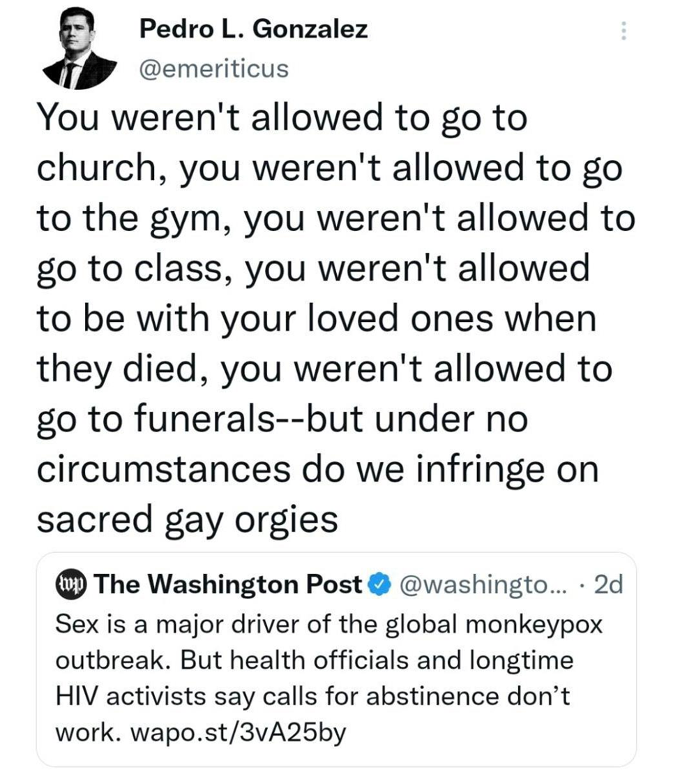 Again, they solemnize sex and sodomize the sacred. They shut down businesses and churches during the COVID “public emergency” and allow gay bars and bath houses to remain open during the “public emergency” of monkey pox.