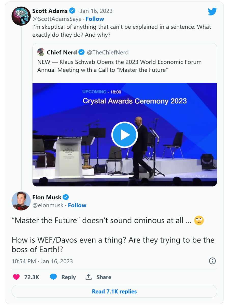 Davos 2023: Major institutions, corporations, billionaires and governments, along with the media, are actively consolidating forces to produce a “one power” world. To wit, the FBI has been “cooperating” with big tech to purge dissenting Americans the DOJ has labeled “conspiracy theory-driven domestic extremists” from public discourse. The following should scare the heck out of you: