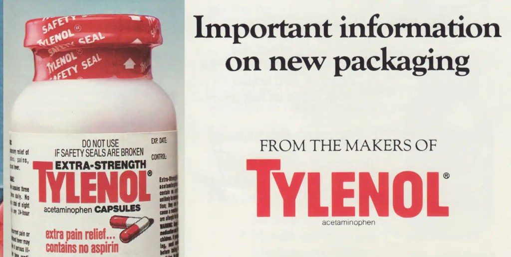 “In 1982 there was a crisis. A depraved madman had laced many Tylenol capsules with potassium cyanide. The ensuing deaths and shock at such a malicious and evil act swiftly brought an industry and FDA forces to action and together started enforcing strict guidelines for tamper-evident packaging.”