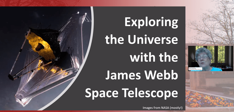 After retiring at the end of last year I joined the Indiana Astronomical Society to learn astronomy. Through IAS I attended the following livestream: Exploring the Universe with the James Webb Space Telescope with Caty Pilachowski, Ph.D.