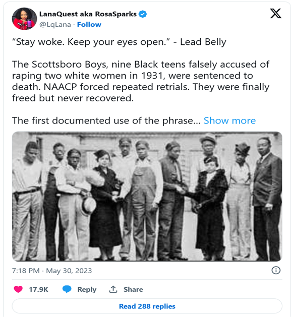 “Stay woke, keep your eyes open” is heard in a recording of Black folk singer Lead Belly. He’s talking about his 1938 song “Scottsboro Boys”. Radio host Lana Quest says it’s the first documented usage of the term.