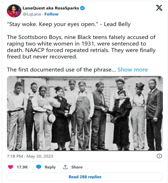 “Woke” and “stay woke” have their origins in African American Vernacular English. But since the time of Lead Belly, “Staying Woke” has been co-opted to become the watchwords of identity politics and the politics of class struggle or wealth distribution.
