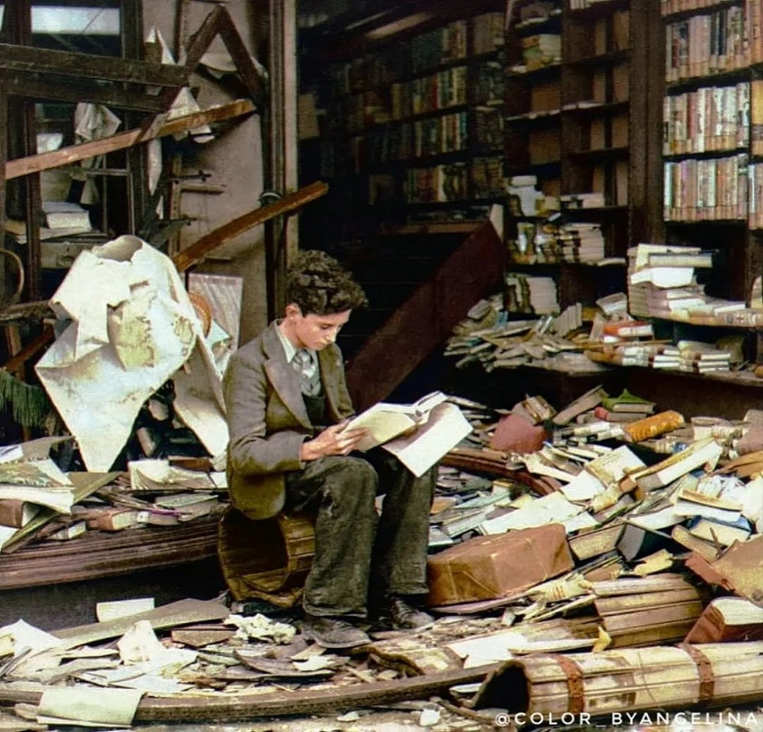 A boy sits and reads among the ruins of a bookshop that was destroyed during an air raid in London, United Kingdom in 1940.