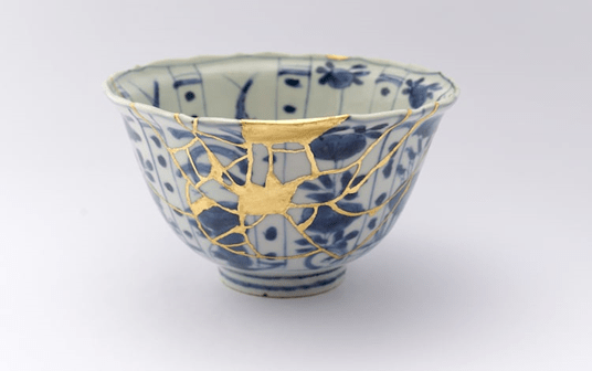 “Poetically translated to “golden joinery,” kintsugi, or Kintsukuroi, is the centuries-old Japanese art of fixing broken pottery. Rather than rejoin ceramic pieces with a camouflaged adhesive, the kintsugi technique employs a special tree sap lacquer dusted with powdered gold, silver, or platinum. Once completed, beautiful seams of gold glint in the conspicuous cracks of ceramic wares, giving a one-of-a-kind appearance to each “repaired” piece.”Kintsugi, a Centuries-Old Japanese Method of Repairing Pottery with Gold (mymodernmet.com)