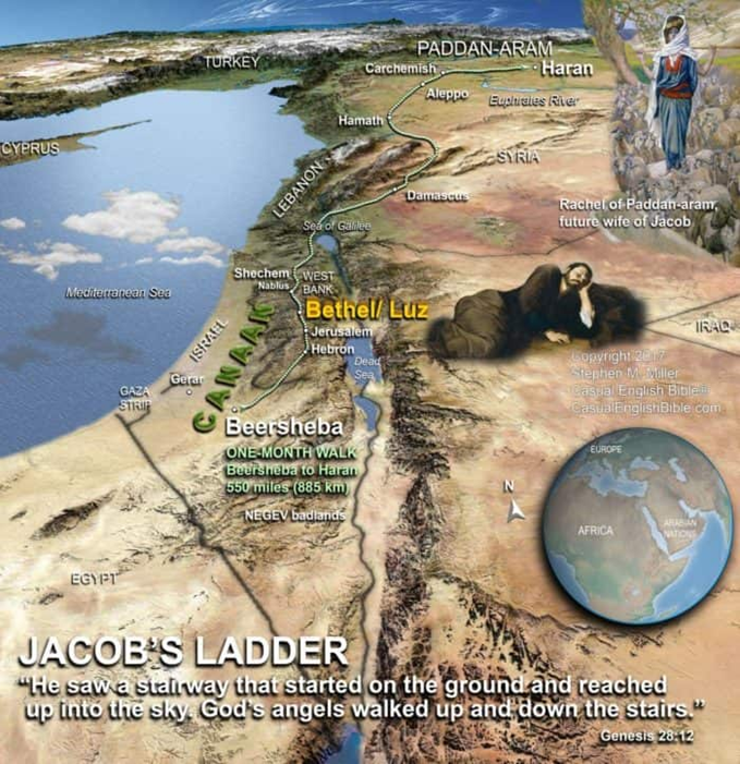 Jacob left his hometown Beersheba in a hurry and headed toward Haran. On his way he came to a place outside the city of Luz in the land of Canaan. He camped there for the night since the sun had set. He took one of the stones there, set it under his head and lay down to sleep. And he dreamed of a ziggurat stairway that reached all the way to the sky. Messengers of God were going up and down the stairway, between earth and heaven. (Genesis 28:10-12)