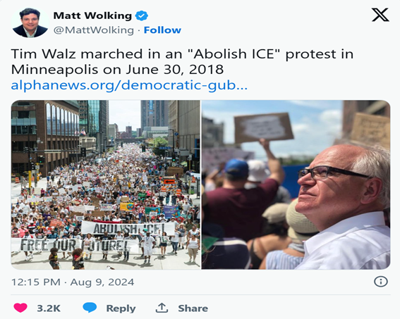 After all, you have to admit that likening ICE to the “KKK” and showing up at an ABOLISH ICE march reveals a deep commitment to keeping our borders wide open and fully vulnerable. Maybe that’s why Kamala, the so-called “border czar,” hardly shows up at the border or does anything to curb the Biden/Harris invasion. With their support for Abolish ICE and Defund the Police, it’s clear that Kamala and Tampon Tim are pushing for a lawless country overrun by foreign illegals and ruthless criminals. Is that the kind of country you want? Vote wisely. (Emphasis mine.)