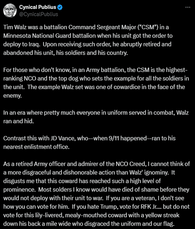 The Pravda-like media would have us warm to and even fawn over the alternate reality the man presents to the public. We are to believe that Tim Walz is just a folksy Minnesotan, nice and neighborly, a populist ‘everyman’, a military and football wonder, and even a Bernie Sanders of the Prairie in hunting gear. But we can’t ignore reality like the Walter Mitty of this election.