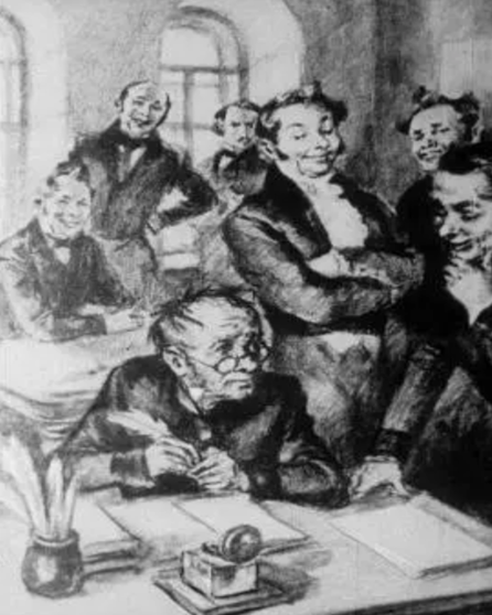 “When and how he entered the department, and who appointed him, no one could remember. However much the directors and chiefs of all kinds were changed, he was always to be seen in the same place, the same attitude, the same occupation; so that it was afterwards affirmed that he had been born in undress uniform with a bald head. No respect was shown him in the department. . . His superiors treated him in coolly despotic fashion.”
