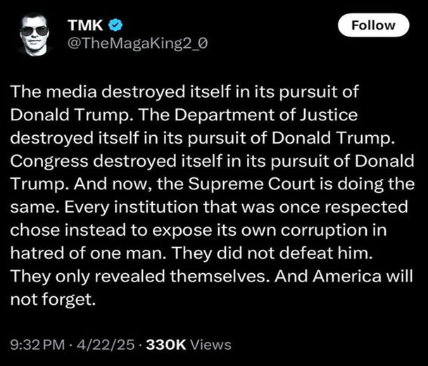 Government of the elites, by the elites, for the elites. Hence, the urgent calls for civil war and Color Revolution. Hence the encouragement of dark woke and talk that nods and winks at people taking matters into their own hands!