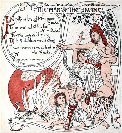 A countryman returning home one winter’s day found a snake by the hedge-side, half dead with cold. Taking compassion on the creature, he laid it in his bosom and brought it home to his fireside to revive it. No sooner had the warmth restored it, than it began to attack the children of the cottage. Upon this the countryman, whose compassion had saved its life, took up a club and laid the snake dead at his feet.
