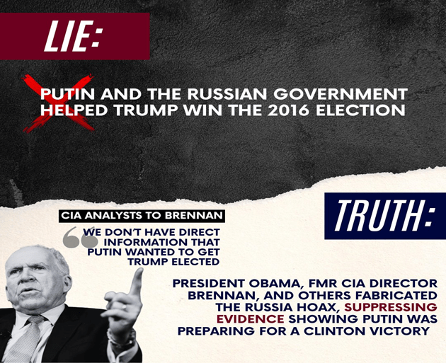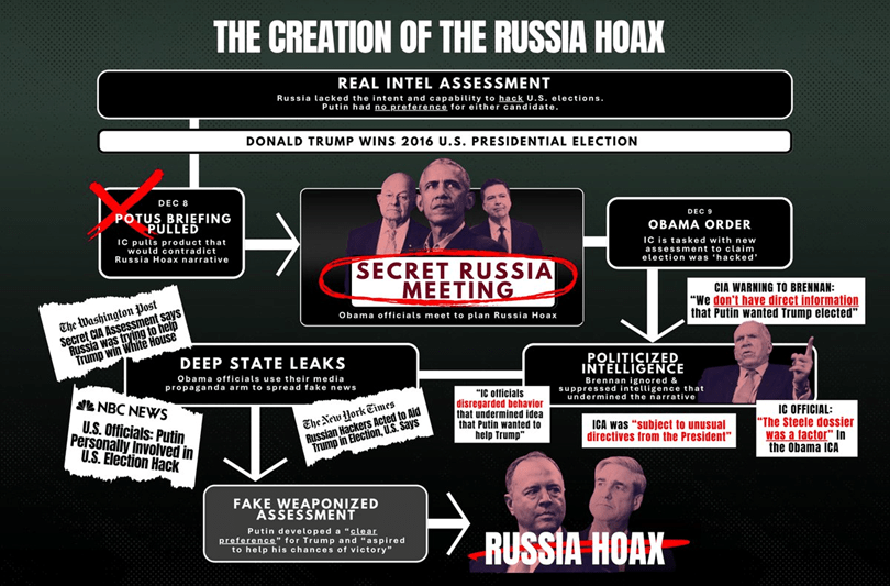 “The Russia Hoax was a lie that was knowingly created by the Obama Administration to undermine the legitimacy and power of the duly elected President of the United States, Donald Trump.” – DNI Tulsi Gabbard