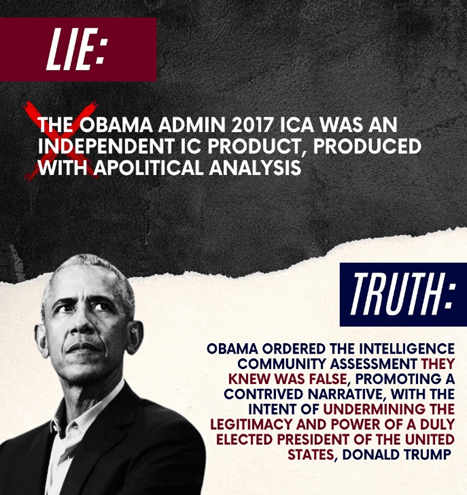 🧵 New evidence has emerged of the most egregious weaponization and politicization of intelligence in American history. Per President @realDonaldTrump’s directive, I have declassified a @HouseIntel oversight majority staff report that exposes how the Obama Administration manufactured the January 2017 Intelligence Community Assessment that they knew was false, promoting the LIE that Vladimir Putin and the Russian government helped President Trump win the 2016 election.