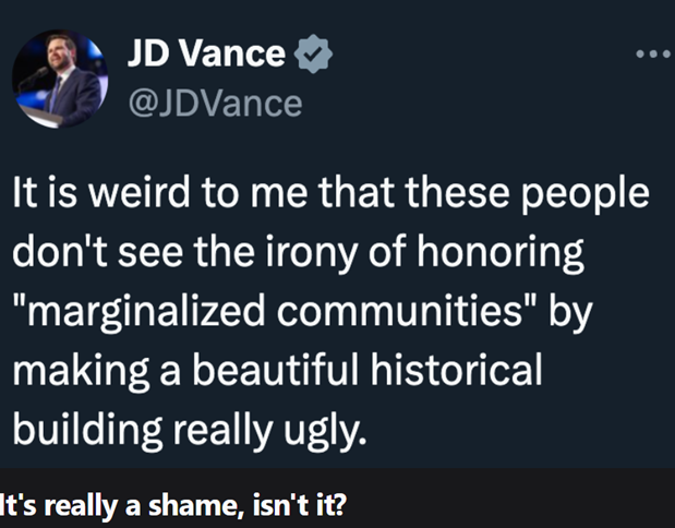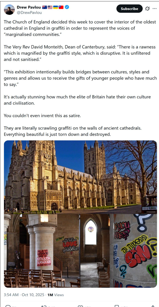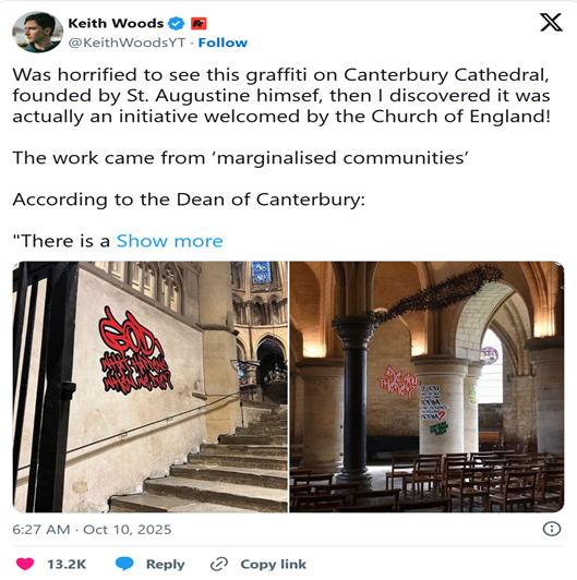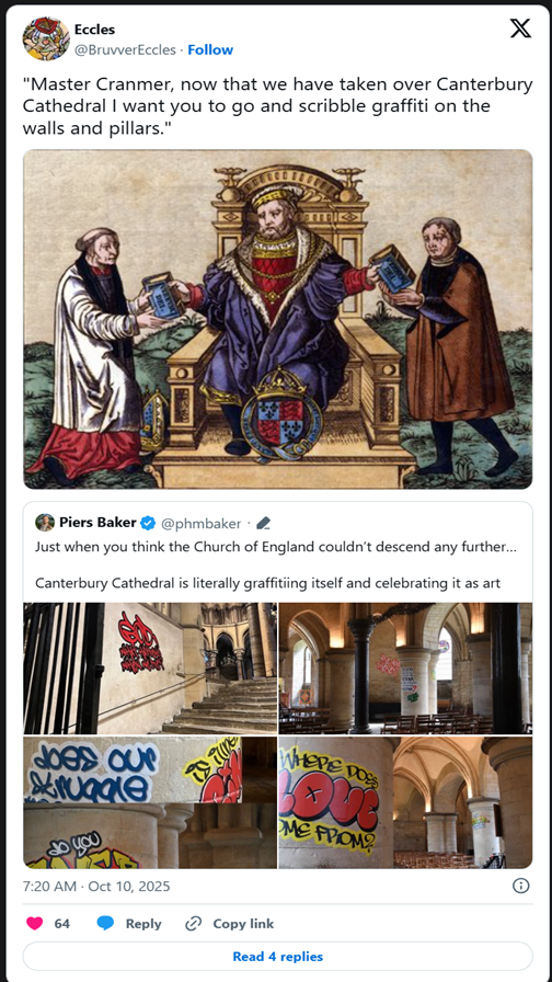 “Progressives really have an extraordinary ability to turn something unbelievably precious and beautiful into utter trash—how can you make Canterbury Cathedral look like a derelict warehouse in an inner city, or resemble a dirty freight train car?”