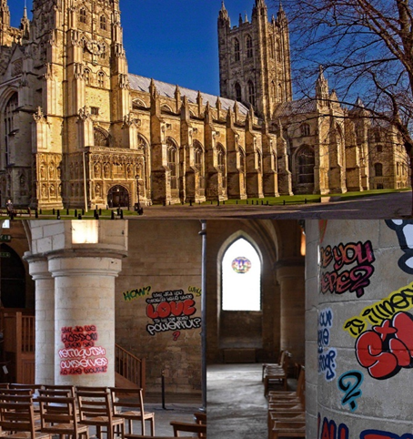 “Canterbury Cathedral, a sixth-century English church—making it more than 1,400 years old—has gotten a paint job…in graffiti. And as it turns out, this act of vandalism wasn’t an act of street delinquency, it was actually commissioned by the church’s stewards. . ..”