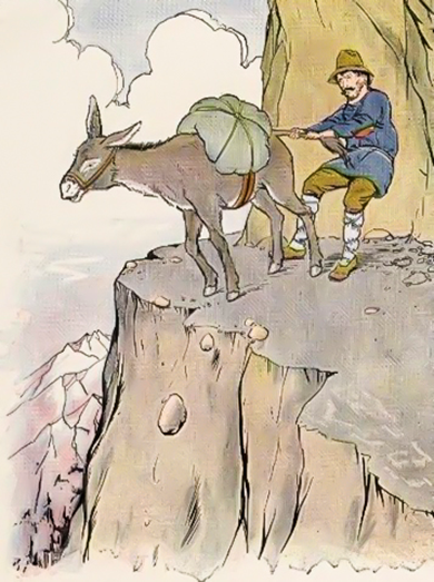 Without listening to his master’s calls, the Ass stubbornly turned aside and headed straight for the edge of the cliff. His master, seeing the danger, grabbed the Ass by the tail and tried to pull him back. But the Ass would not listen and pulled with all his might.